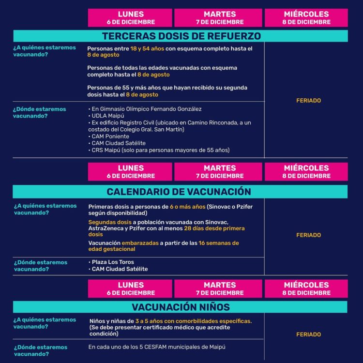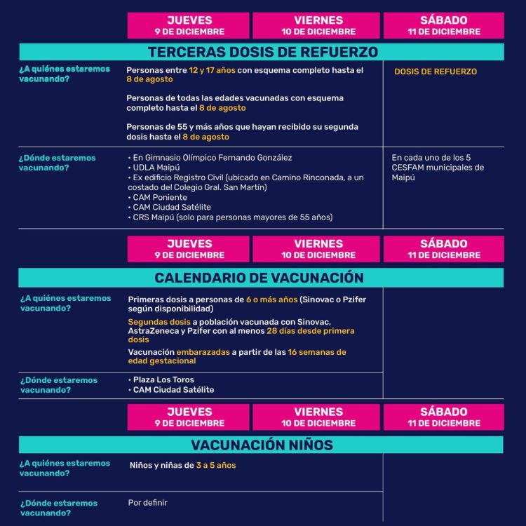 Entre el lunes 6 y el martes 7 se podrán vacunar los niños y niñas de 3 a 5 años con comorbilidades específicas (presentando certificado médico que acredite condición). En tanto el jueves 9 y viernes 10 pueden vacunarse los niños y niñas de 3 a 5 años. ¿Dónde? En los 5 Cesfam municipales de Maipú (ver detalle al final de la nota).
