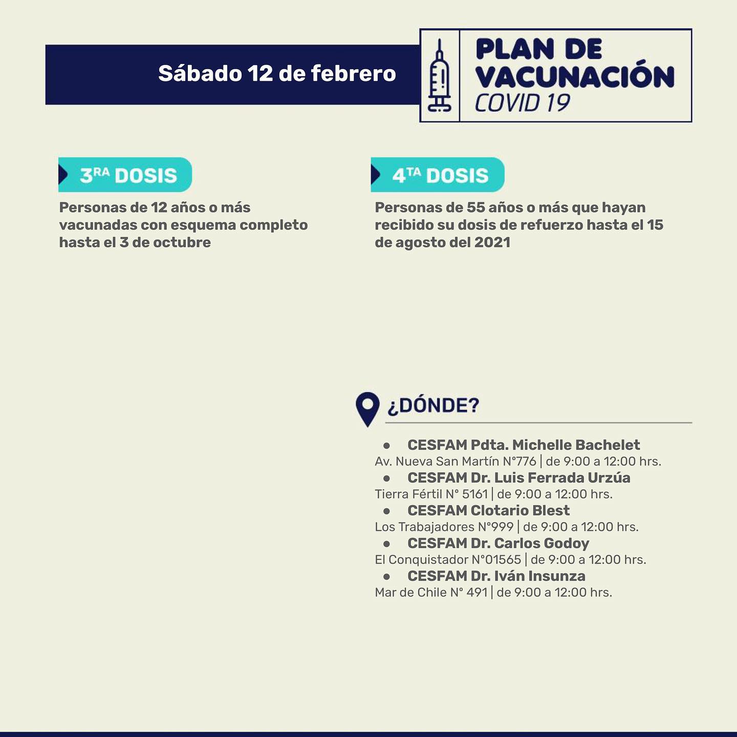 CRS Maipú (camino a Rinconada 1001) de 8:30 a 13:00 hrs. y de 14:00 a 16:30 hrs. (sólo 3a y 4a dosis).