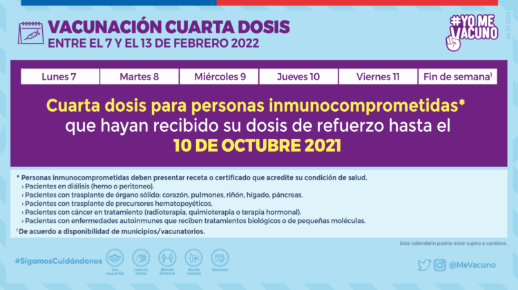 Esta semana se podrán vacunar con cuarta dosis las personas inmunocomprometidas que hayan recibido su dosis de refuerzo hasta el 10 de octubre de 2021, deben presentar receta o certificado que acredite su condición de salud.