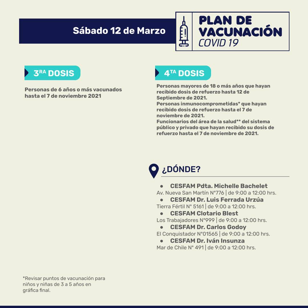 - Ex edificio Registro Civil (costado colegio Gral. San Martín) de 11:00 a 16:30 hrs. (sólo dosis de refuerzo Pfizer para niñas y niños de 6 a 11 años).