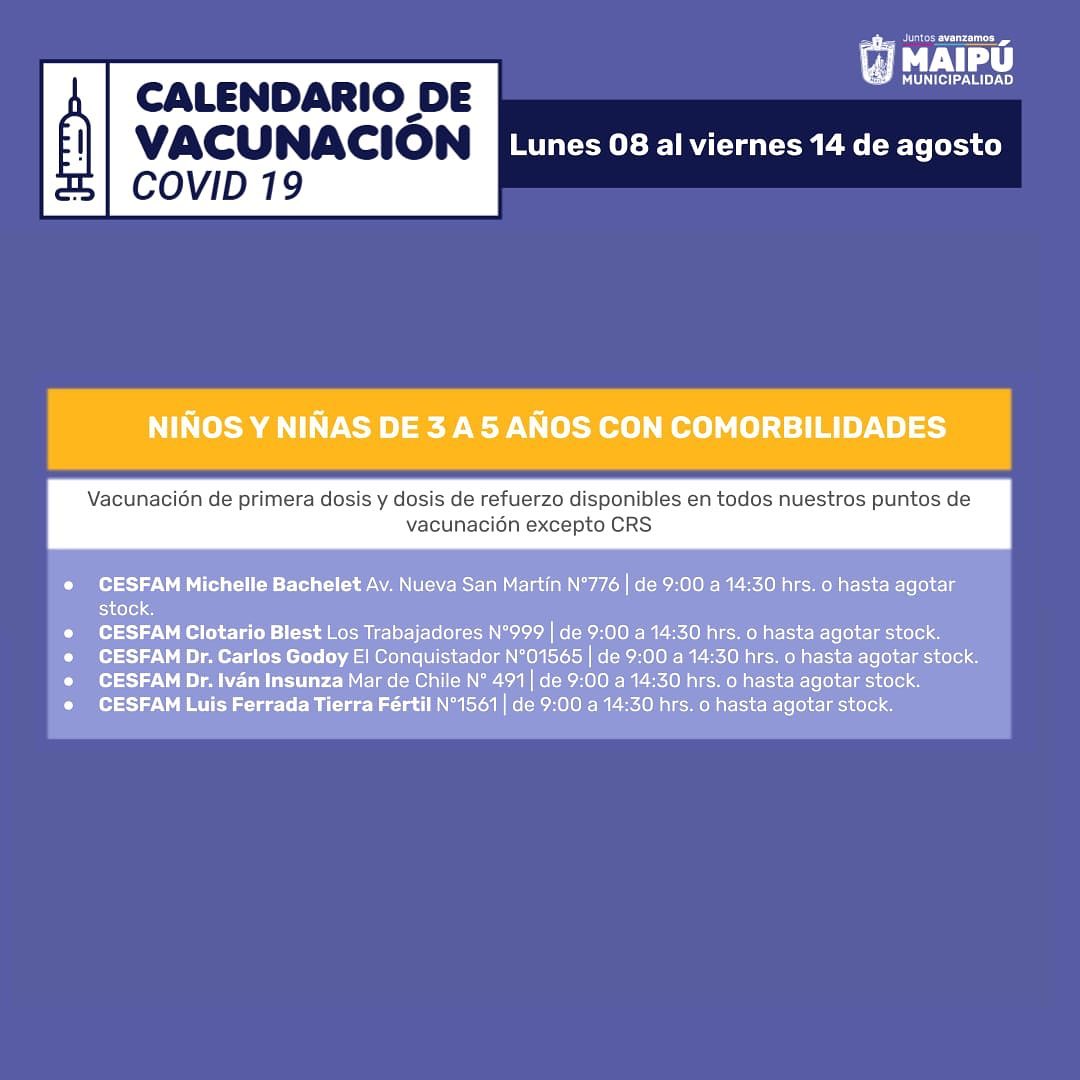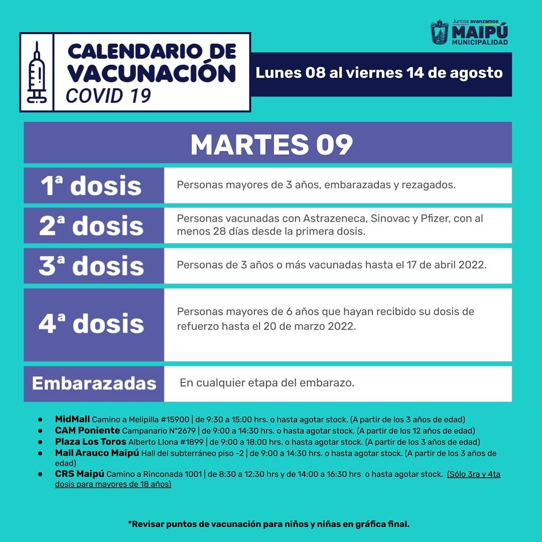 A continuación, el Calendario de vacunación del Ministerio de Salud para la semana del 8 al al 14 de agosto de 2022, seguido del Calendario de vacunación de la Municipalidad de Maipú con sus respectivos locales de vacunación y horarios de atención.