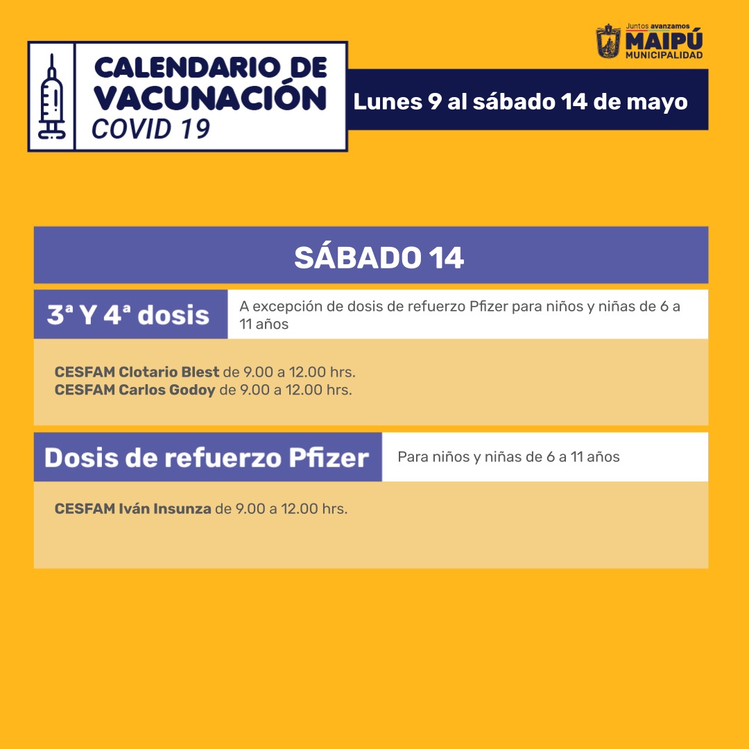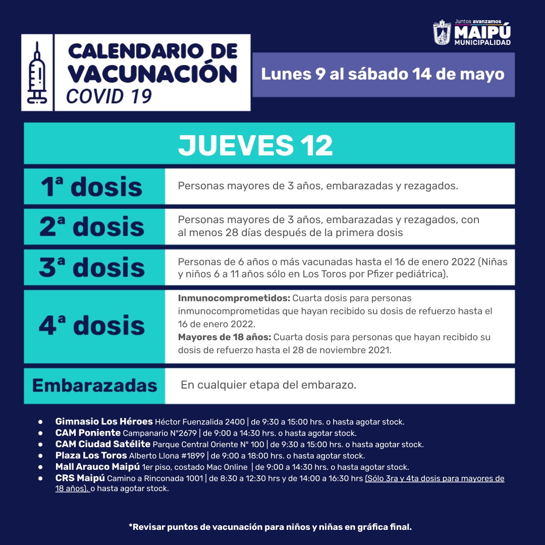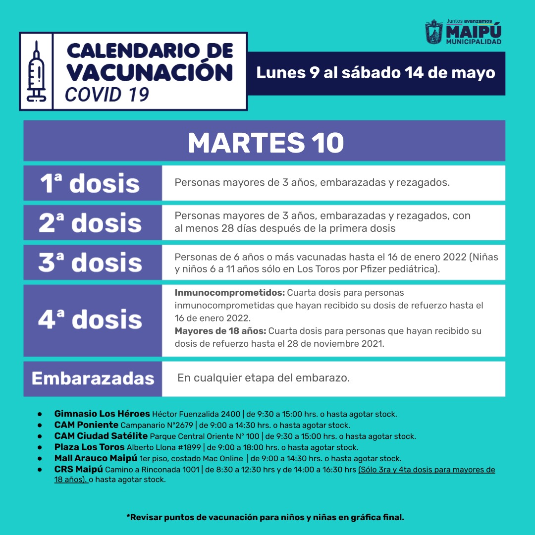 - CRS Maipú (camino a Rinconada 1001) de 8:30 a 12:30 hrs. y de 14:00 a 16:30 hrs. (sólo tercera y cuarta dosis para mayores de 18 años) o hasta agotar stock.