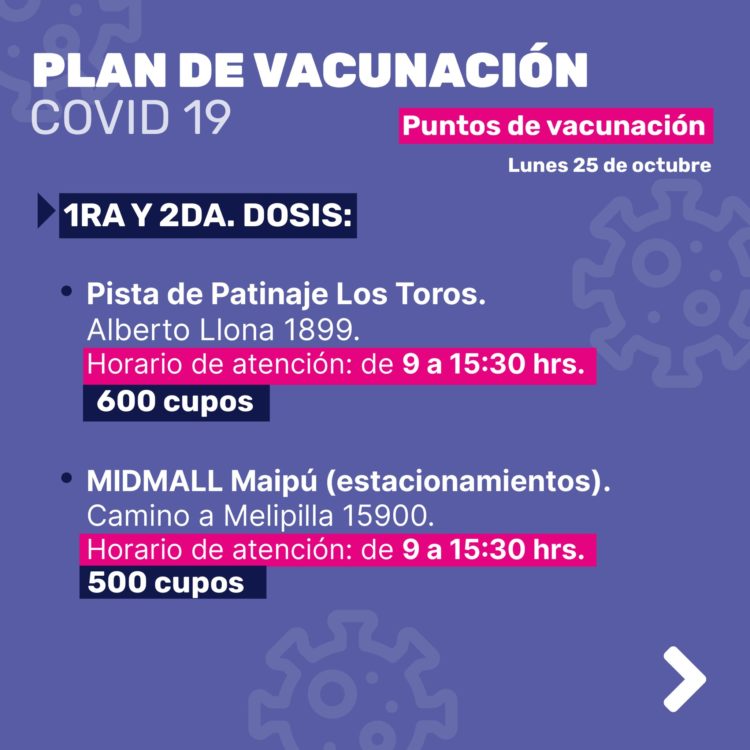 Los siguientes locales continuarán vacunando, con cupos limitados, en los siguientes horarios el día lunes 25 de octubre (los demás días de la semana se informará en las redes sociales del municipio de Maipú):