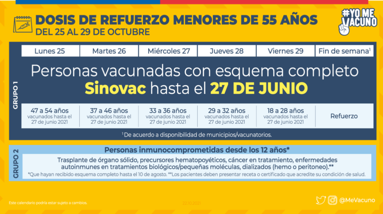 En la semana se vacunará con la tercera dosis de refuerzo a menores de 55 años vacunados con Sinovac hasta el 27 de junio y con una vacuna distinta de Sinovac hasta el 23 de mayo. Asimismo se pueden vacunar los mayores de 55 años con esquema completo hasta el 27 de junio y las personas inmunocomprometidas desde los 12 años.