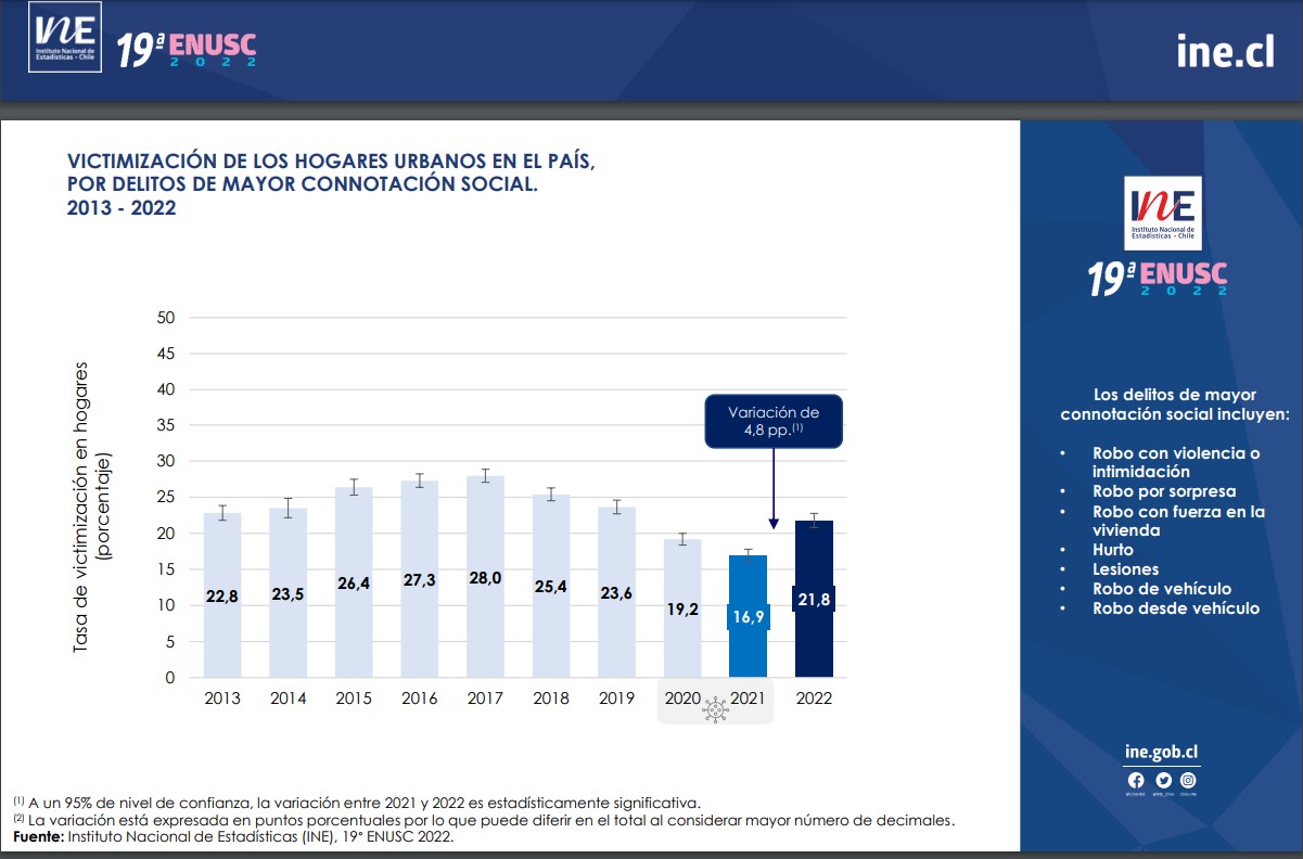 • 19ª ENUSC 2022. La Encuesta Nacional Urbana de Seguridad Ciudadana (ENUSC) es producto de un convenio de colaboración entre la Subsecretaría de Prevención del Delito y el Instituto Nacional de Estadísticas, siendo parte fundamental en la medición de la seguridad ciudadana en el país.