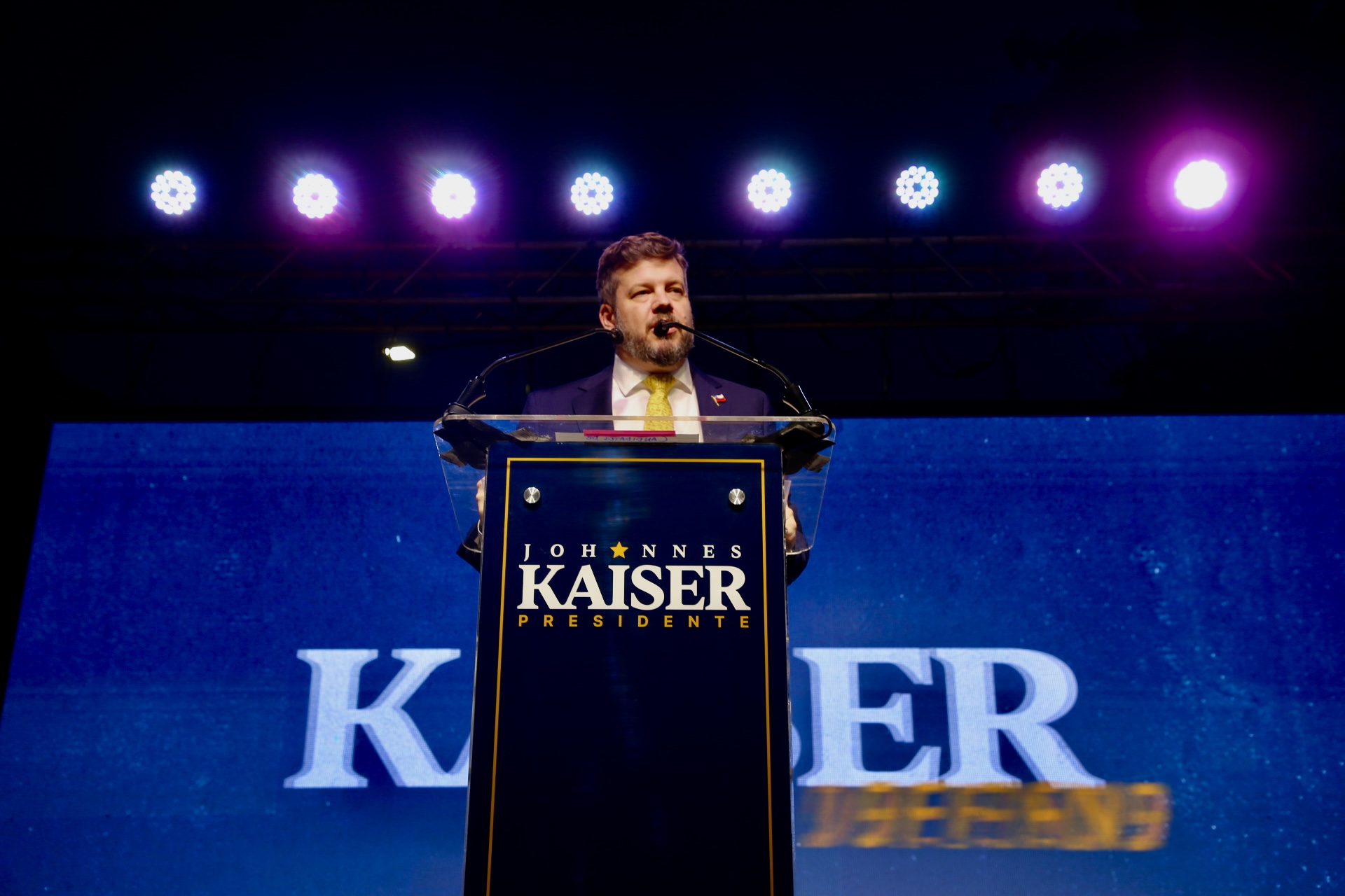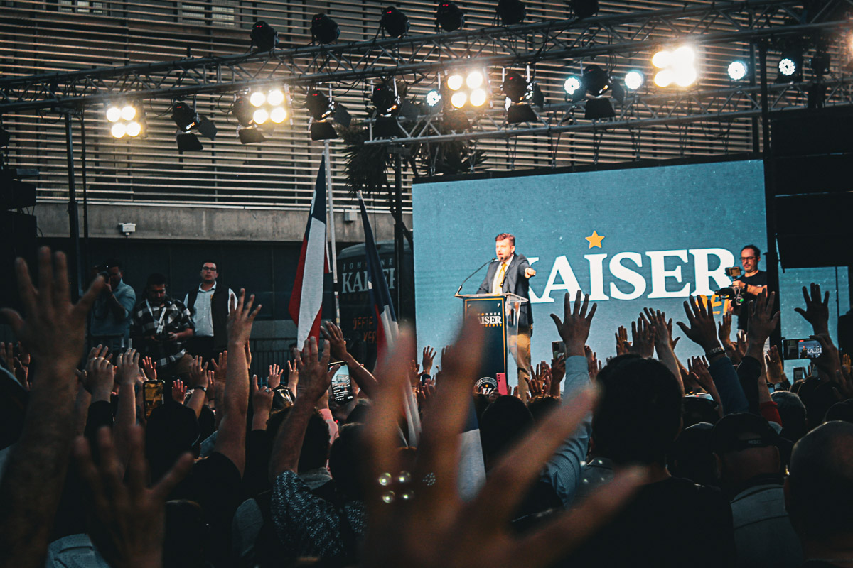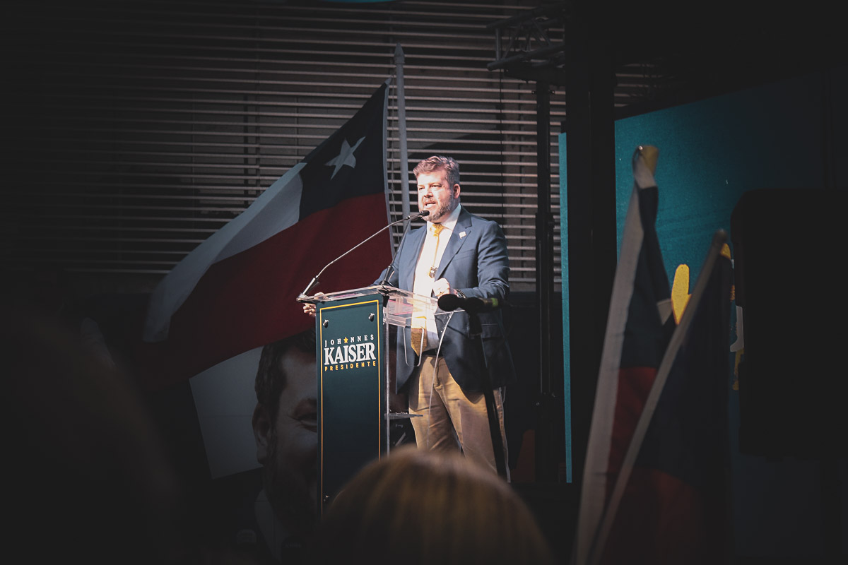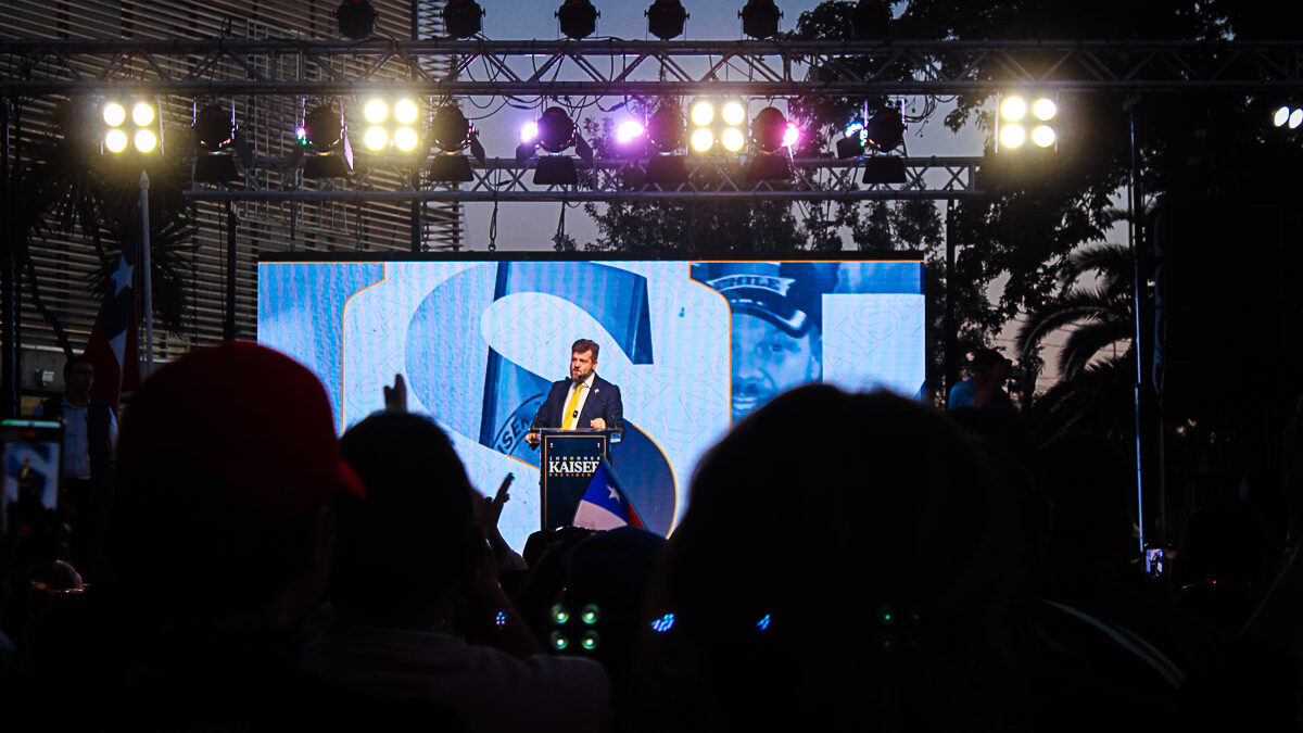 Dirigiéndose a los asistentes desde un escenario montado en este sector, bien iluminado y con llamativas cortinas propagandísticas de fondo donde se exaltaba la figura del candidato, Kaiser va endureciendo su tono a medida que avanza en su discurso.