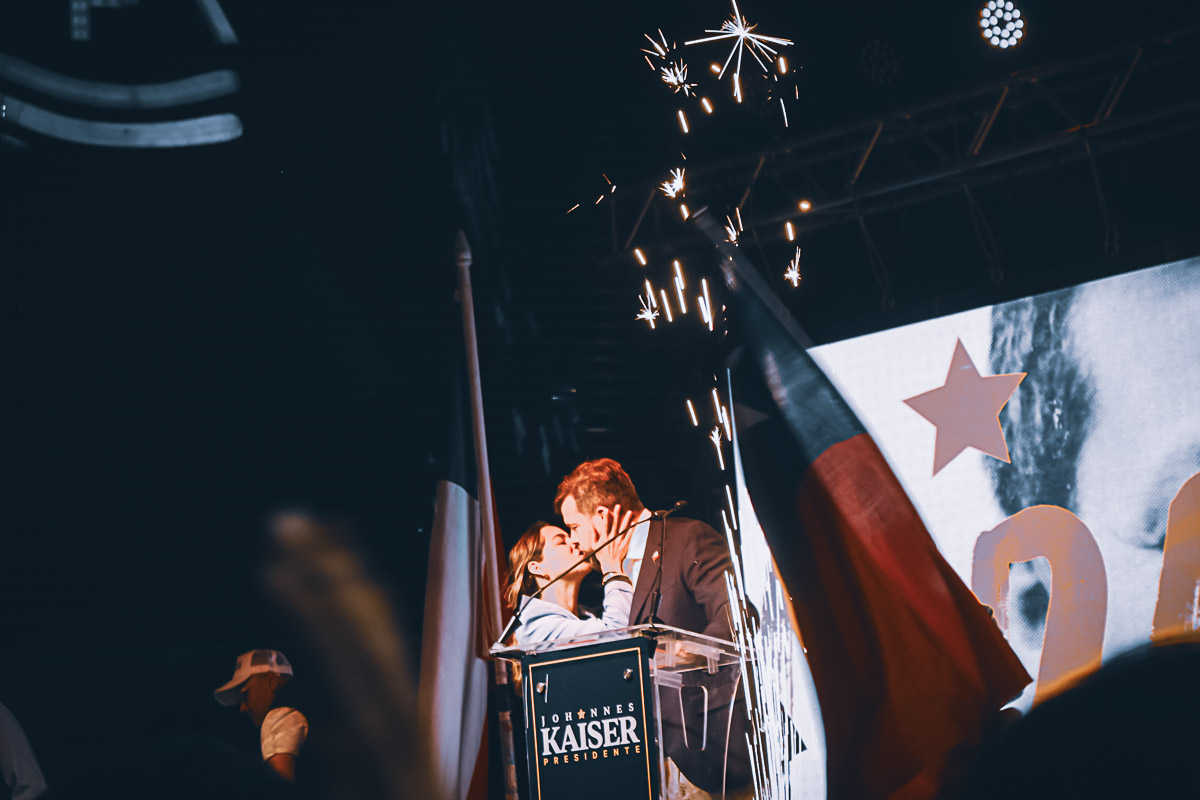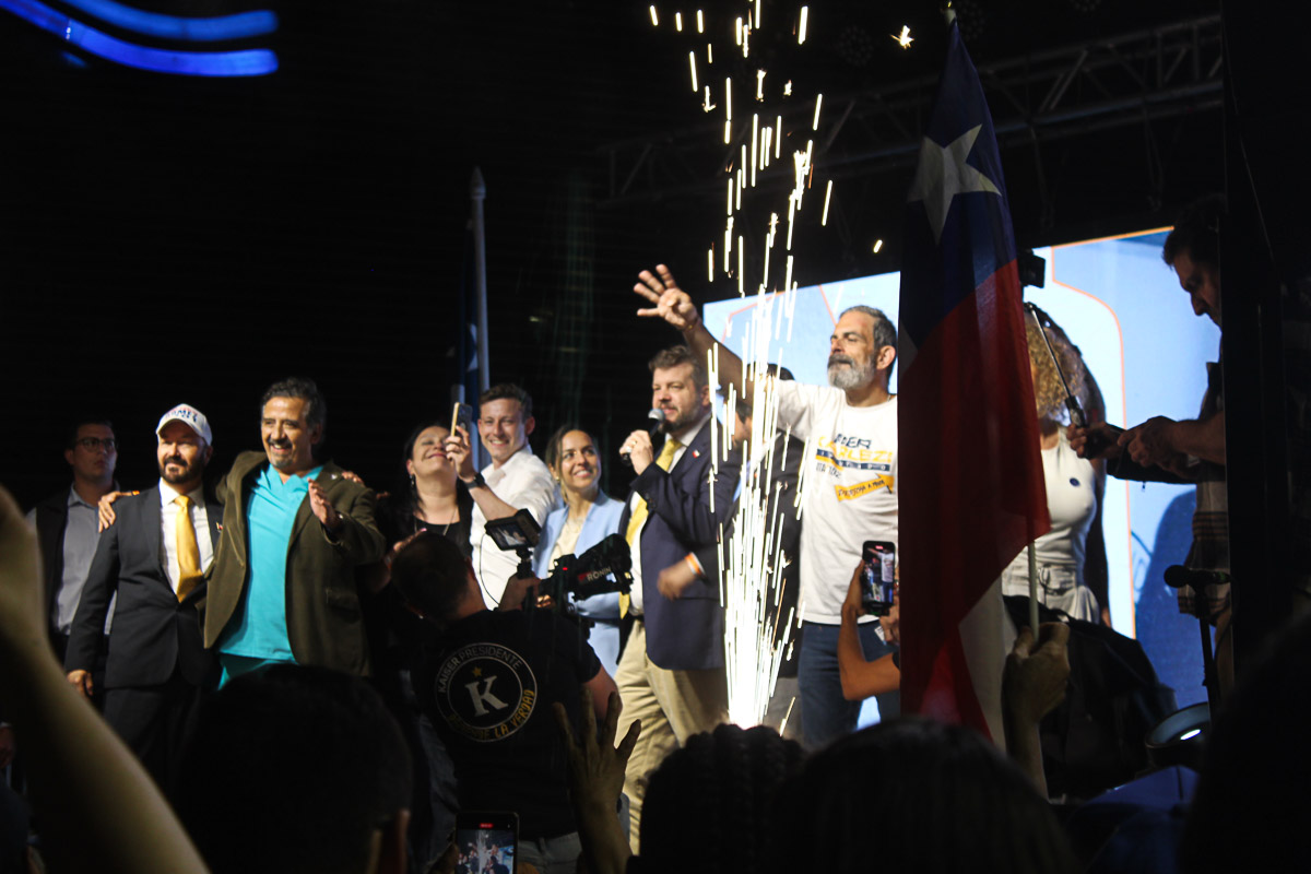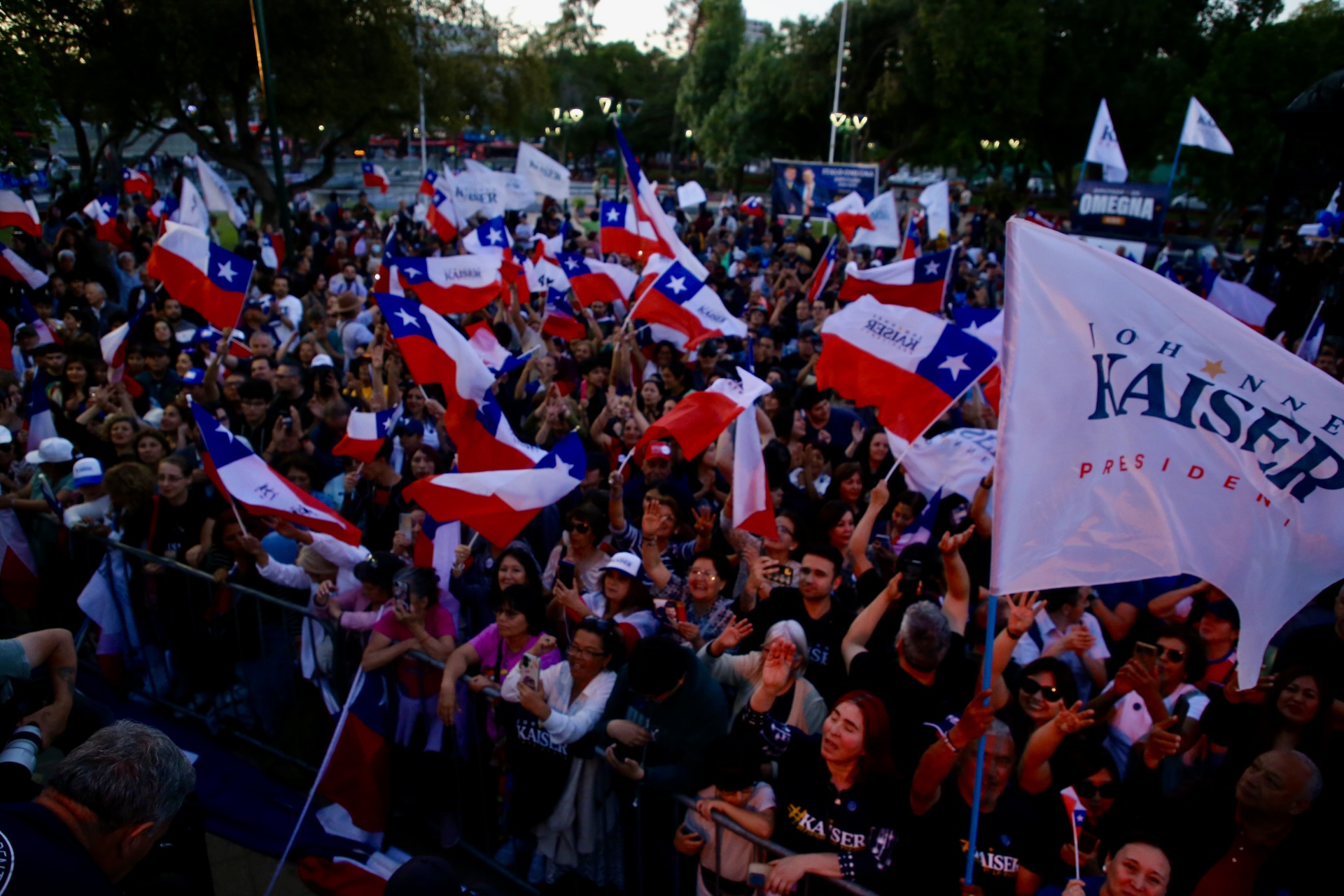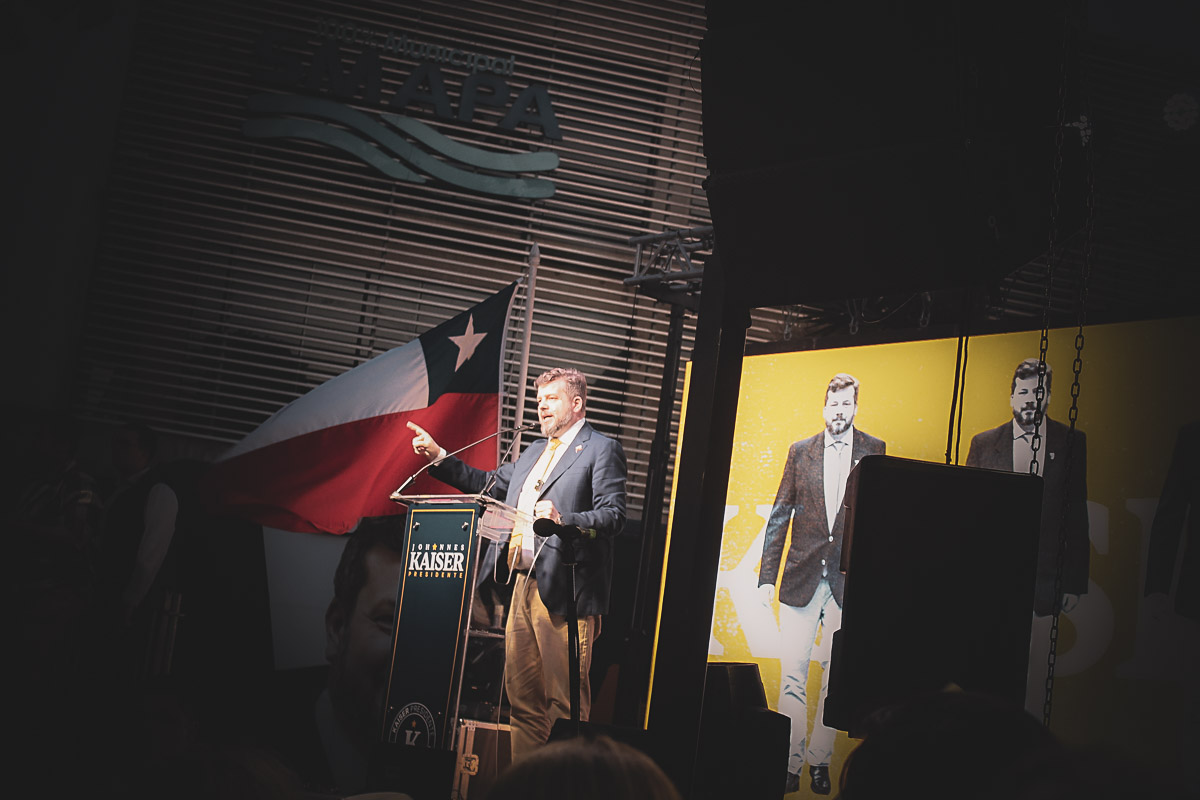 Dirigiéndose a los asistentes desde un escenario montado en este sector, bien iluminado y con llamativas cortinas propagandísticas de fondo donde se exaltaba la figura del candidato, Kaiser va endureciendo su tono a medida que avanza en su discurso.