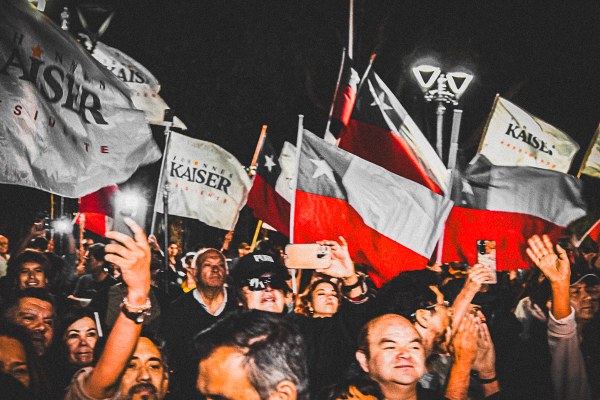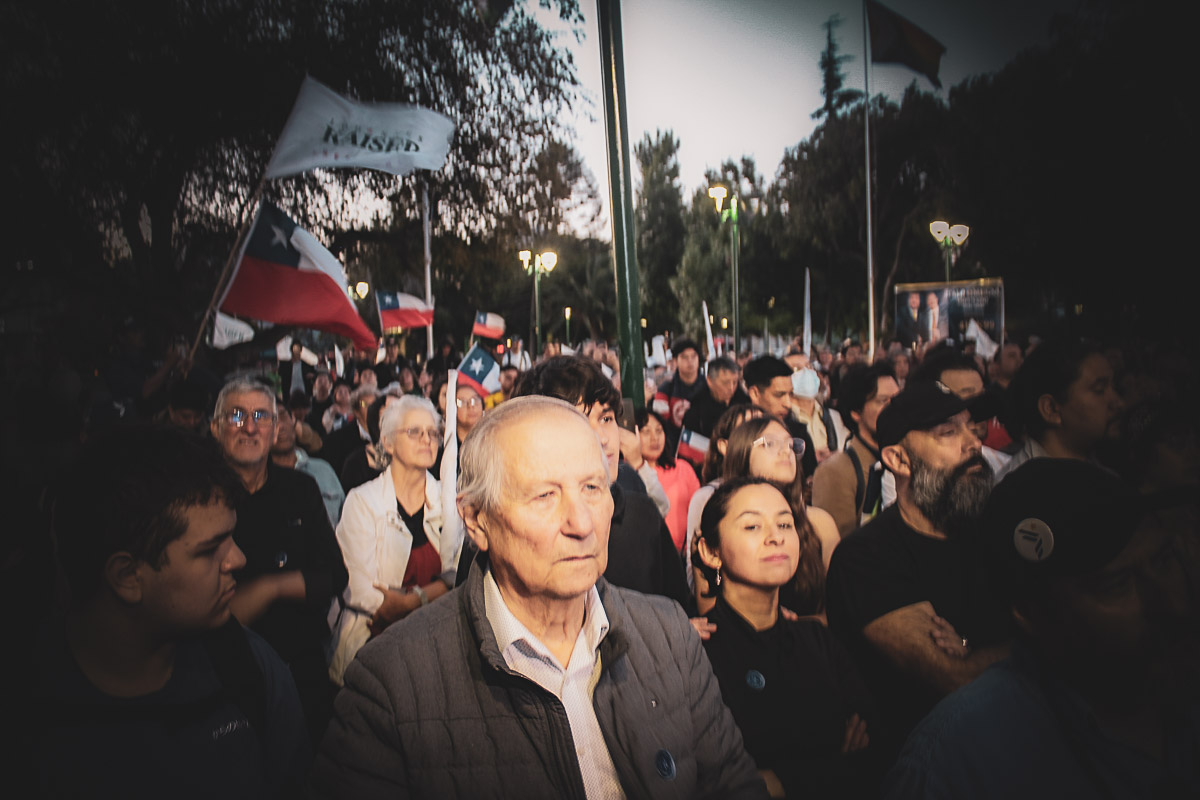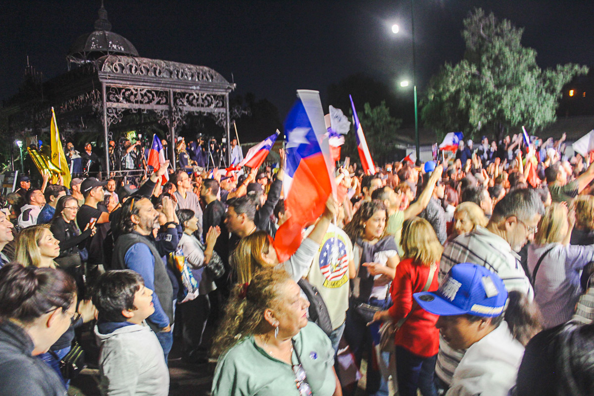 Pasadas las 19:00 horas, el candidato libertario a las futuras elecciones presidenciales, Johannes Kaiser, habló a sus partidarios que se congregaron en el costado del Odeón de la Plaza de Maipú.