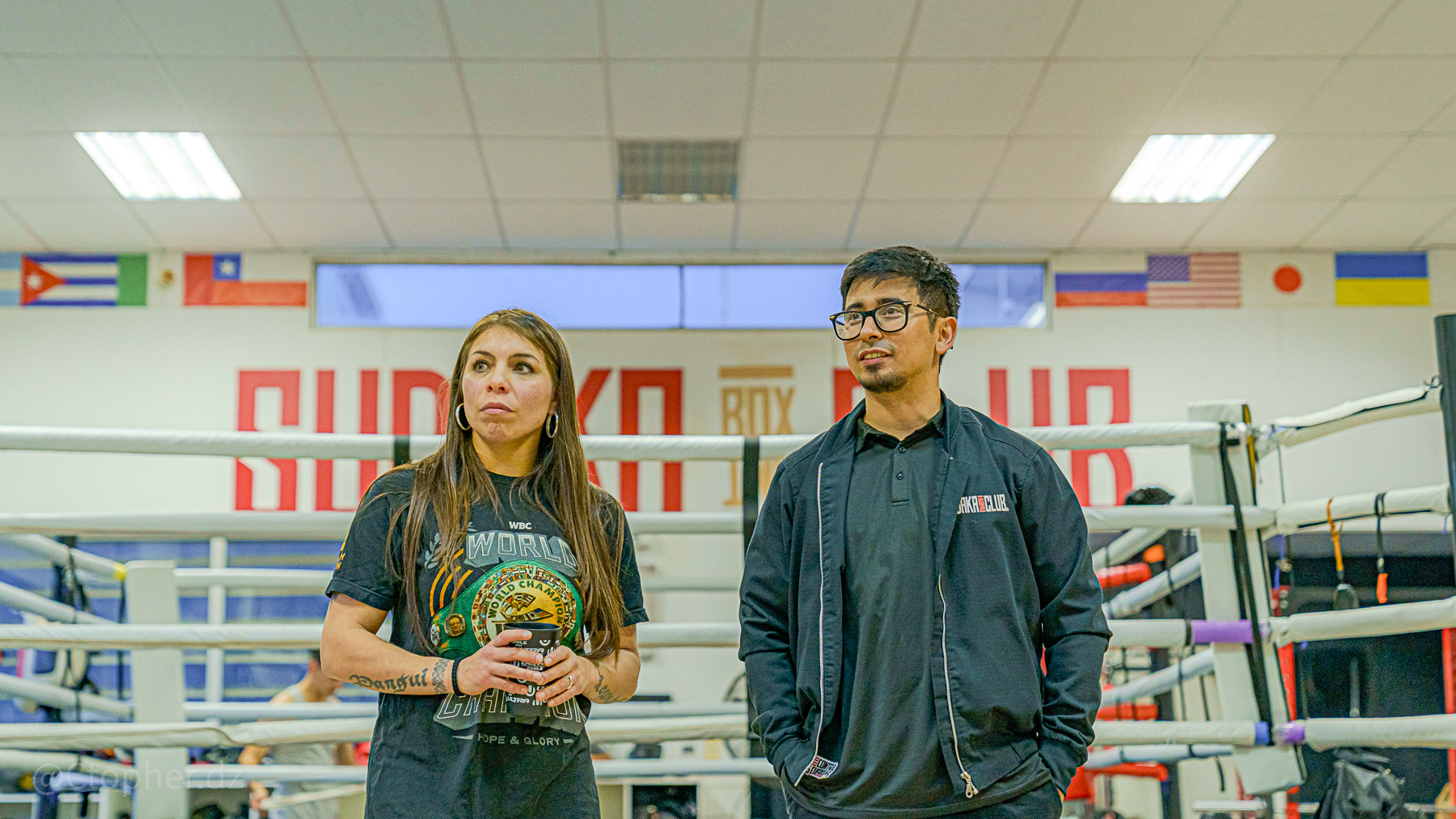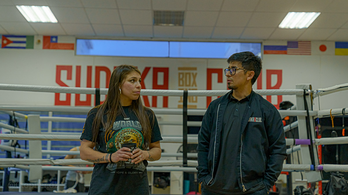 Daniela «La Leona» Asenjo y Marcelo Gomez, fundador del Sudaka Boxing Club en Maipú, foto para La Batalla por Christopher Díaz