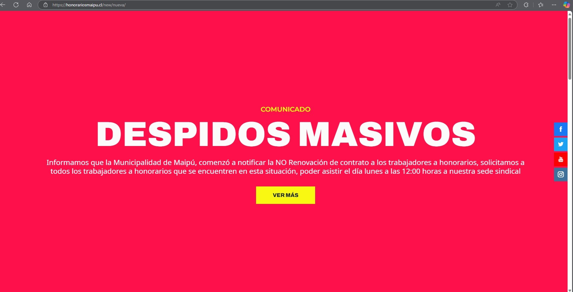 En su sitio web, el Sindicato de Trabajadores a Honorarios de Maipú publicó un comunicado titulado: “COMUNICADO: DESPIDOS MASIVOS”, en el que informaron a la comunidad que la Municipalidad de Maipú comenzó a notificar la no renovación de contrato a los trabajadores a honorarios.