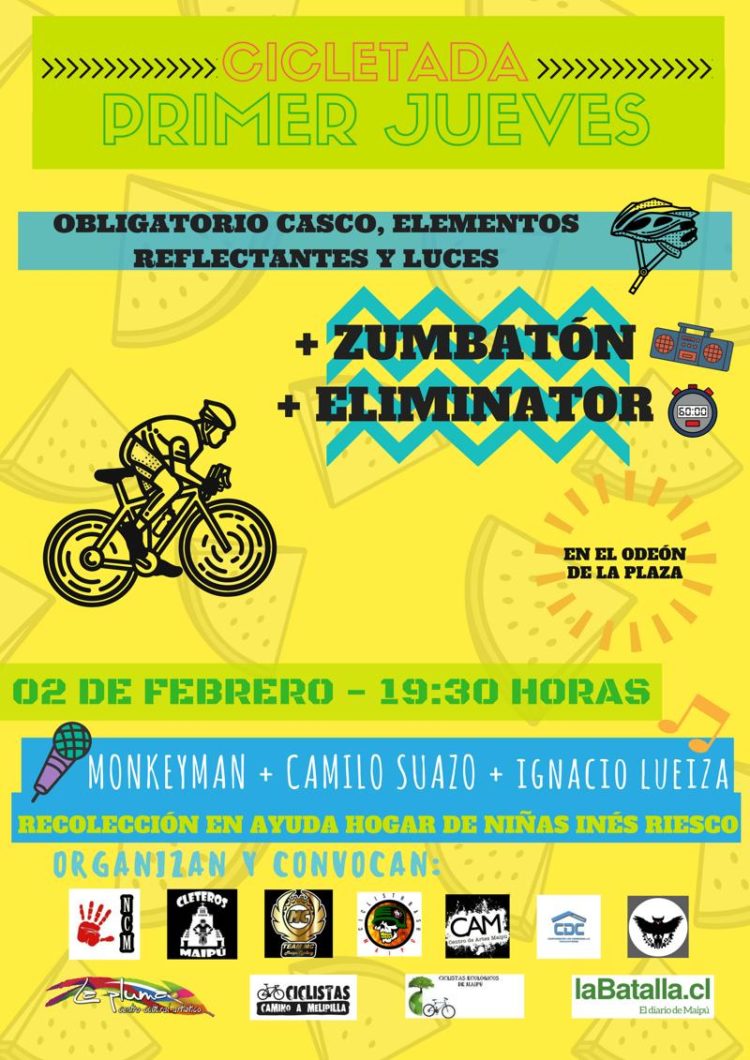 El próximo jueves 02 de febrero desde las 19:30 horas en el Odeón de la Plaza se realizará una vez más a la ya clásica «Cicletada del Primer Jueves», instancia que ofrece una notable diversidad de actividades (algunas de ellas paralelas en diferentes puntos de la comuna) como la imperdible zumbatón a cargo de Zumberas Rinconada 3 Poniente, música en vivo con Monkeyman, Camilo Suazo e Ignacio Lueiza, competencia cletera «Eliminator» y por supuesto la mejor ruta ciclista que pueda encontrar, recorriendo las calles y barrios de nuestro querido Maipú. Se estará además recibiendo comida no perecible, artículos de aseo, papel higiénico y detergente que irá en ayuda del hogar de niñas Inés Riesco Llona.