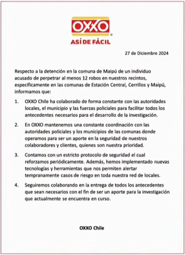 Desde OXXO Chile, cadena afectada por los robos, informaron que han colaborado de forma constante con las autoridades locales, municipios y fuerzas policiales para facilitar la investigación. “Seguiremos colaborando para aportar a la investigación que actualmente se encuentra en curso”, aseguraron en un comunicado oficial.