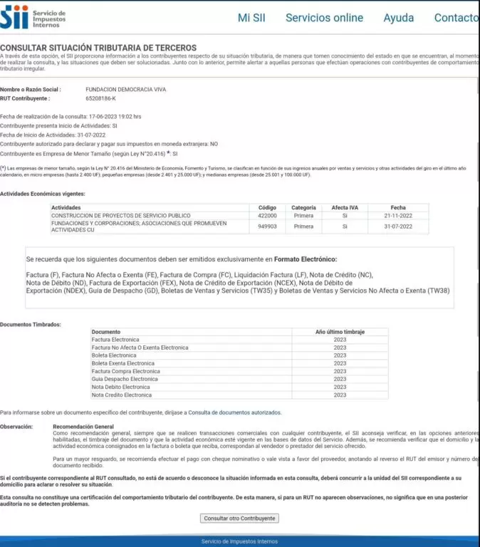 Sin embargo, tal como pudo constatar la Unidad de Investigación de Radio Bio Bio, al momento del primer y segundo convenio (el 3 y 27 de octubre de 2022) y habiéndose decretado la transferencia por $370 millones de pesos a Democracia Viva, su giro original ante el Servicio de Impuestos Internos (SII) era el de «Asociaciones que promueven actividades culturales o recreativas (31-07-2022)».