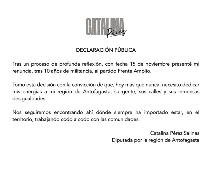 La diputada por la región de Antofagasta, Catalina Pérez, renunció oficialmente al Frente Amplio. La solicitud de renuncia fue presentada el viernes 15 de noviembre, un día después que se publicaran nuevos antecedentes relacionados con la investigación del Caso Convenios, que involucrarían directamente a la parlamentaria.