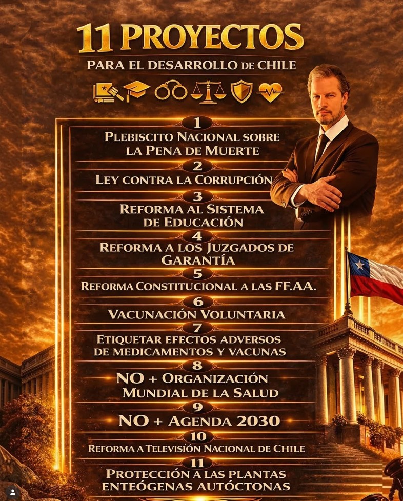 Entre las iniciativas más comentadas está la propuesta para desligarse de la Organización Mundial de la Salud (OMS): «por estafa, no más al negocio de la salud, tenemos que confirmar que Chile tenga el control de sus propias decisiones» señaló, y la propuesta de convocar a un plebiscito nacional sobre la reinstauración de la pena de muerte.