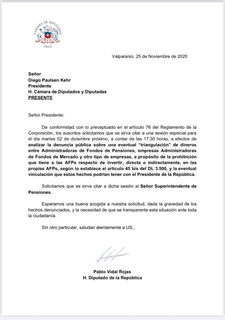 A continuación se puede ver la carta de solicitud y la firma de los 53 parlamentarios que aprobaron la sesión especial a realizarse el martes 1 de diciembre, en el «caso triangulación» que involucraría al Presidente Piñera.