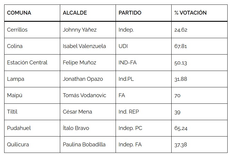Las comunas del distrito 8 están lideradas por los siguientes alcaldes (elecciones 2024):