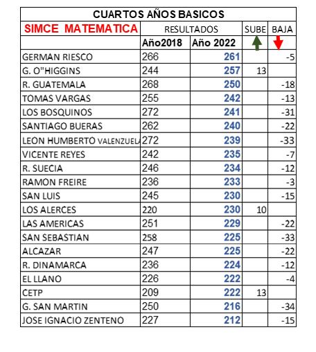 Así es como en LENGUAJE han subido su puntaje de manera significativa, entre otros, el Colegio General O’Higgins (+32), Colegio Tomás Vargas (+22), Colegio Ramón Freire (+20). Por otra parte, hay también bajas notorias como es el caso del Colegio General San Martín (-31), Colegio El Llano (-27) y el Colegio Alcázar (-21).
