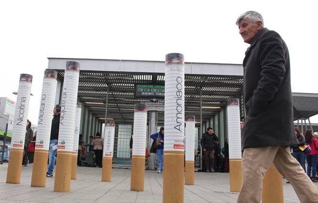 Buscando concientizar a peatones que el humo del tabaco contiene más de 4 mil productos químicos, al menos 250 de ellos nocivos y más de 50 cancerígenos, es que cada cigarrillo (de más de un metro y medio de altura) indicó algunos de sus componentes como amoniaco, nicotina y alquitrán, llamando la atención de quienes pasaron por el lugar.