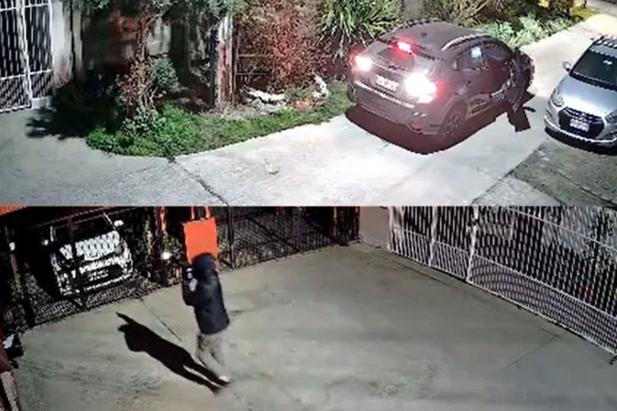 El registro muestra cómo un automóvil se detiene frente a la vivienda y un individuo con el rostro cubierto desciende armado.
