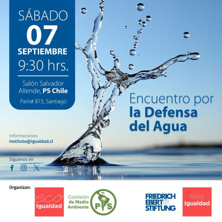 Con el objetivo de  construir una Agenda Ciudadana por la Defensa del Agua, con perspectiva “democrática, participativa y justa”, se llevará a cabo este sábado 7 de septiembre el Encuentro 2024 por la Defensa del Agua, que organiza la Comisión de Medio Ambiente del Partido Socialista y Ecoigualdad (Programa de Medio Ambiente del Instituto Igualdad, centro de pensamiento del PS Chile), con la colaboración de la Fundación Friedrich Ebert.