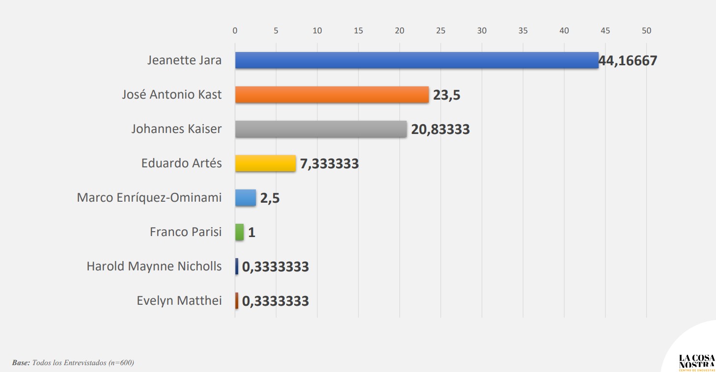 - Al explorar en este eventual escenario de segunda vuelta, el candidato Nacional Libertario Johannes Kaiser obtendría un 53,99 % y la candidata oficialista Jeannette Jara un 47,49%