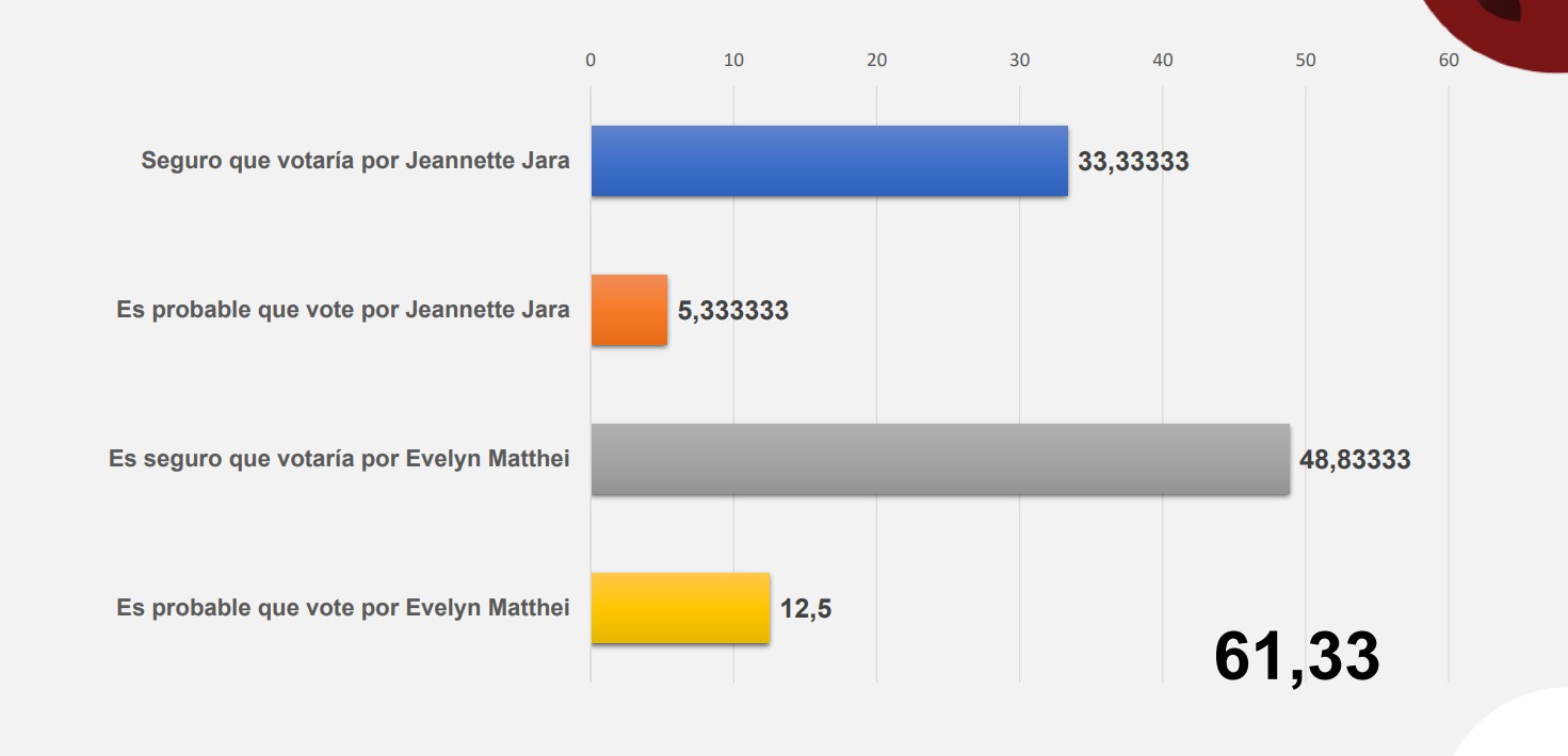 Mientras que Matthei se impondría con mayor diferencia en una eventual confrontación a Jara, alcanzando un 62% de apoyo, lo que se relaciona con su mejor evaluación en atributos personales.
