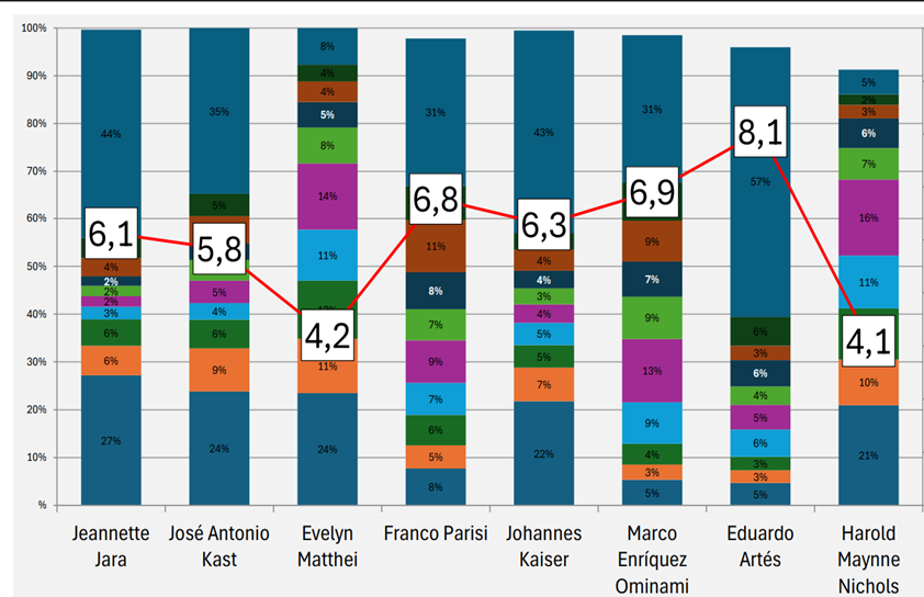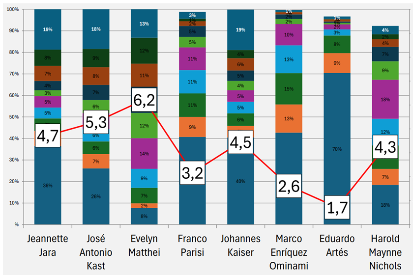 En la dimensión de peligrosidad política, Kaiser (6,3) es percibido como el más peligroso entre los candidatos de derecha para la estabilidad del país, mientras que Jara (6,1) mantiene una percepción intermedia.