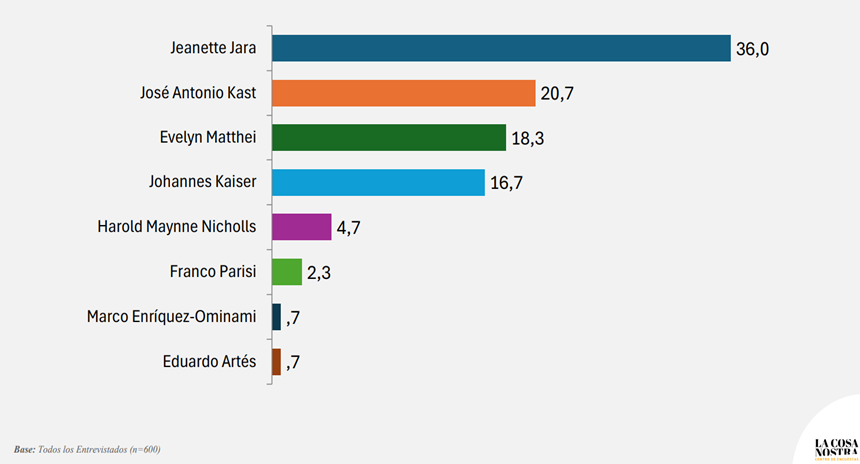 Quien resulte ganador o ganadora en el sector de la derecha en esta primera vuelta, por razones evidentes, obtendrá una votación inferior a la de Jara, dado que la derecha divide su apoyo entre tres candidaturas altamente competitivas que buscan captar la mayor adhesión dentro del 60% del electorado que se inclina por este sector. En esta disputa se enfrentan la candidata de Chile Vamos (UDI), Evelyn Matthei; el candidato del Partido Republicano, José Antonio Kast; y el libertario Johannes Kaiser.
