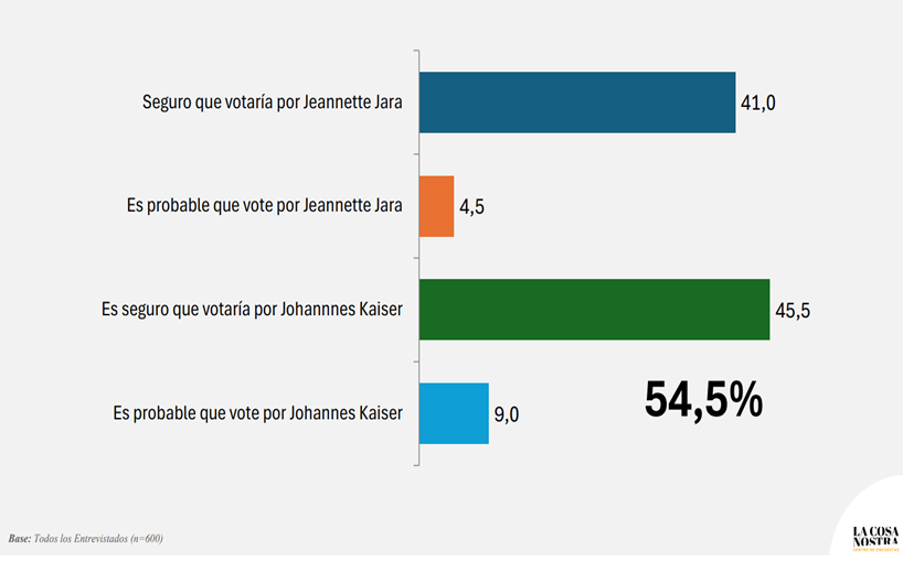 Johannes Kaiser, en tanto, obtendría 54,5%, superando a Jara por más de siete puntos.