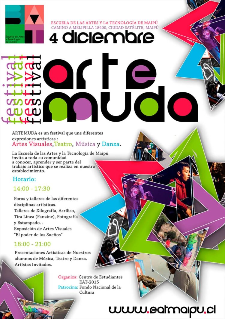 La Escuela de las Artes y la Tecnología de Maipú -EAT-, establecimiento dependiente de la CODEDUC, invita a la comunidad a su Festival ARTEMUDA, a realizarse el viernes 04 de dicimbre desde las dos de la tarde.