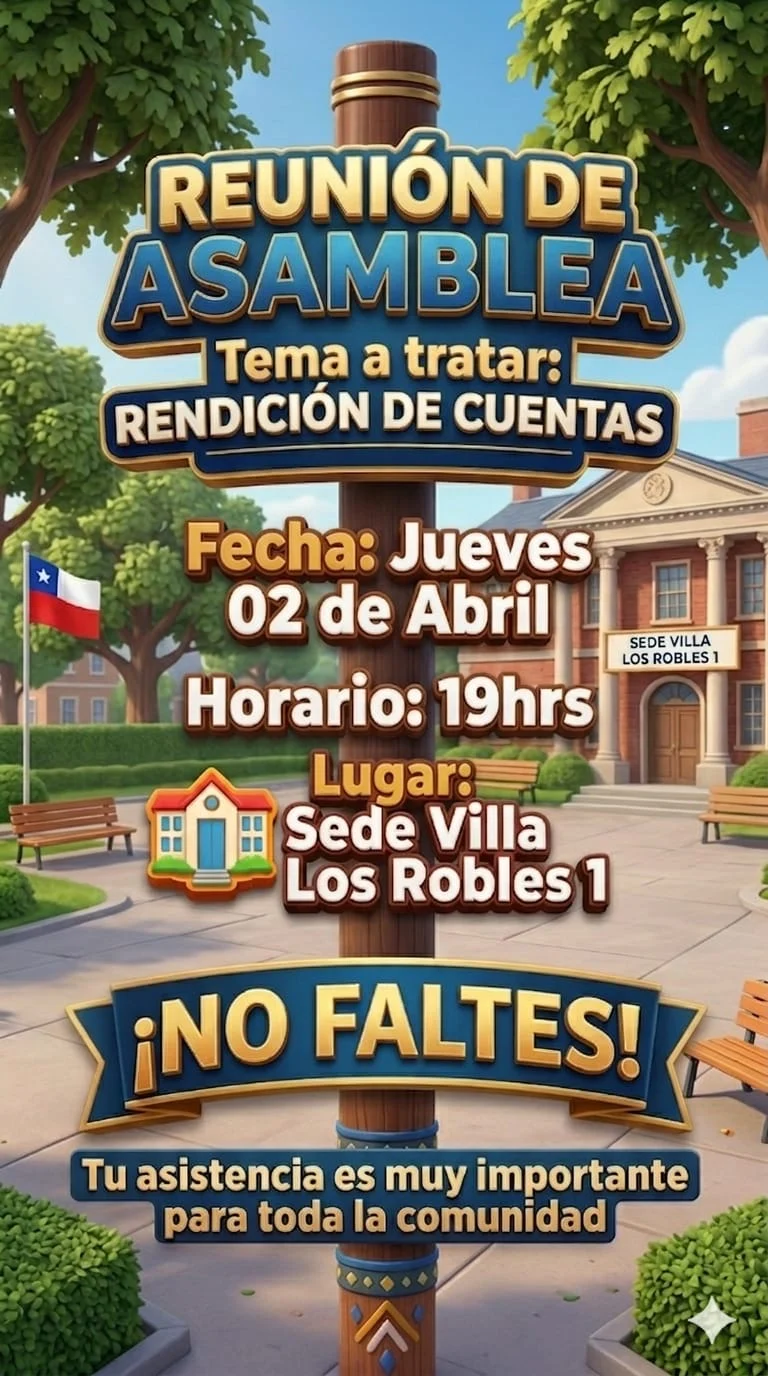 Luego de que se suspendiera la citación original del pasado martes 31 de marzo, este jueves 2 de abril se llevará a cabo la esperada rendición de cuentas de la Junta de Vecinos Villa Los Robles I, ubicada en El Huaso 2515en el barrio Sol Poniente.