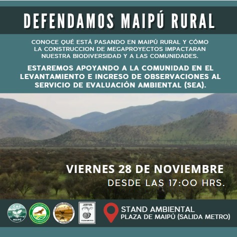 La Agrupación por la Defensa de la Quebrada de La Plata, el Comité Ambiental Comunal de Maipú (CAC Maipú) y agrupaciones territoriales realizarán este viernes 28 de noviembre, desde las 17:00 horas, una jornada informativa en la Plaza de Maipú, a la salida del Metro, para informar sobre el impacto que distintos megaproyectos podrían generar en el sector rural de la comuna.