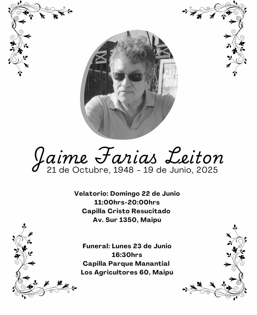 La ceremonia fúnebre será el lunes 23 a las 16:30 hrs. en la Capilla del Parque Manantial (Los Agricultores 60, Maipú).