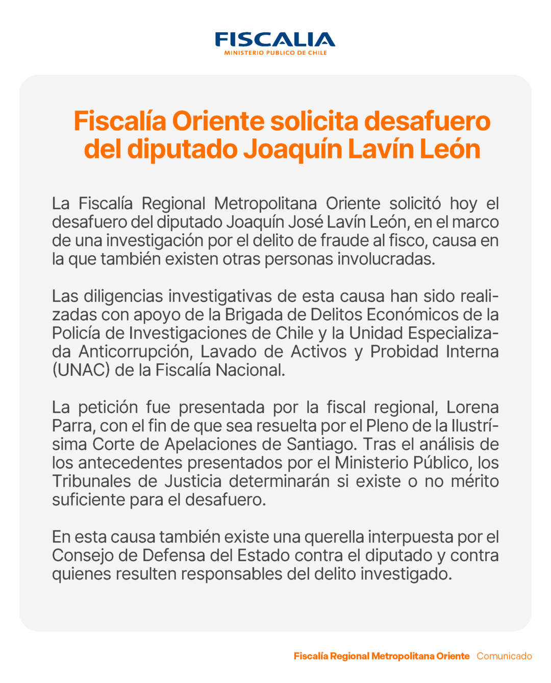 La Fiscalía Metropolitana Oriente solicitó este viernes 27 de junio el desafuero del diputado Joaquín Lavín León, exmiembro de la UDI, en el marco de una investigación por presunto fraude al fisco, negociación incompatible y tráfico de influencias. El objetivo es retirarle la inmunidad parlamentaria para formalizar cargos en su contra.