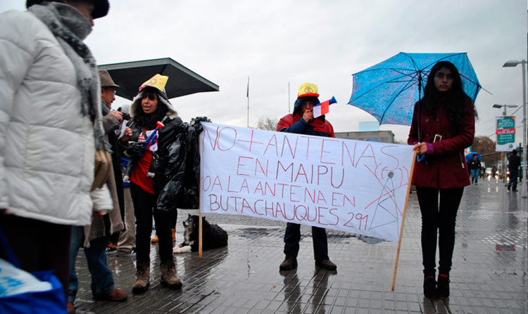 A pesar de la lluvia y del frío unas veinte personas llegaron hasta la plaza de Maipú, la tarde del sábado 07 de junio, para protestar por la instalación de antenas de telecomunicaciones en numerosos puntos de la comuna.