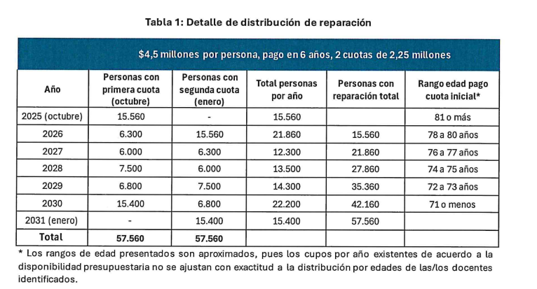 Finalmente, en 2024, el Ministerio de Educación presentó una propuesta que ha sido aceptada por cerca del 80% de los más de 20 mil docentes consultados el 28 y 29 de octubre. Esta iniciativa contempla un pago de 4,5 millones de pesos chilenos para cada profesor afectado, distribuidos en cuotas según la edad de los beneficiarios. El pago se dividirá en plazos que comenzarán en 2025 y se extenderán hasta 2031.
