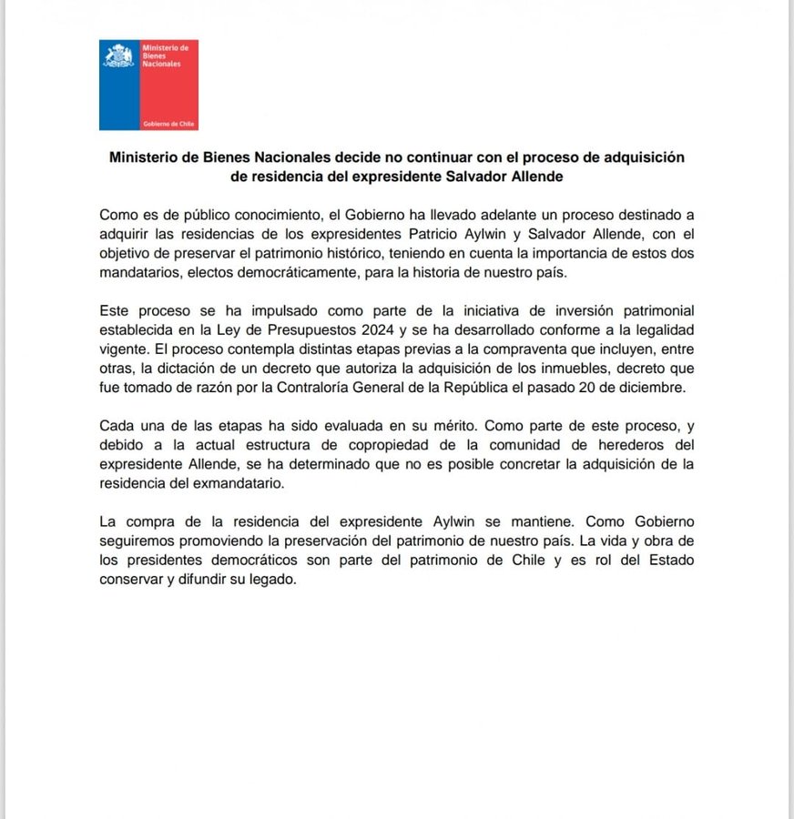 “Debido a la actual estructura de copropiedad de la comunidad de herederos del expresidente Allende, se ha determinado que no es posible concretar la adquisición de la residencia del exmandatario“, afirmó el Ministerio.