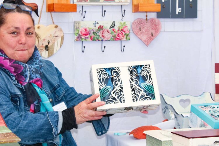 Entre las participantes de esta feria, se encuentra Gloria Moraga, creadora de Grafa Manualidades, un emprendimiento familiar que se dedica a la confección de cajitas en madera MDF y tallados en madera reciclada. Gloria es parte de la agrupación Mujeres Creadoras, y habitualmente se instala en Avenida El Rosal, en Maipú, donde ofrece sus productos al público.