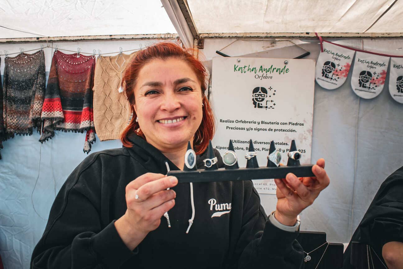 Finalmente, Katha Andrade, orfebre y miembro de la agrupación Mujeres Creadoras, también participó en esta feria. Su especialidad es la creación de joyas y atrapasoles, trabajando con piedras de protección y metales como la alpaca, cobre, bronce y plata. Katha resaltó la importancia de estos eventos para mostrar la calidad y originalidad de los productos que ofrece junto a sus compañeras.
