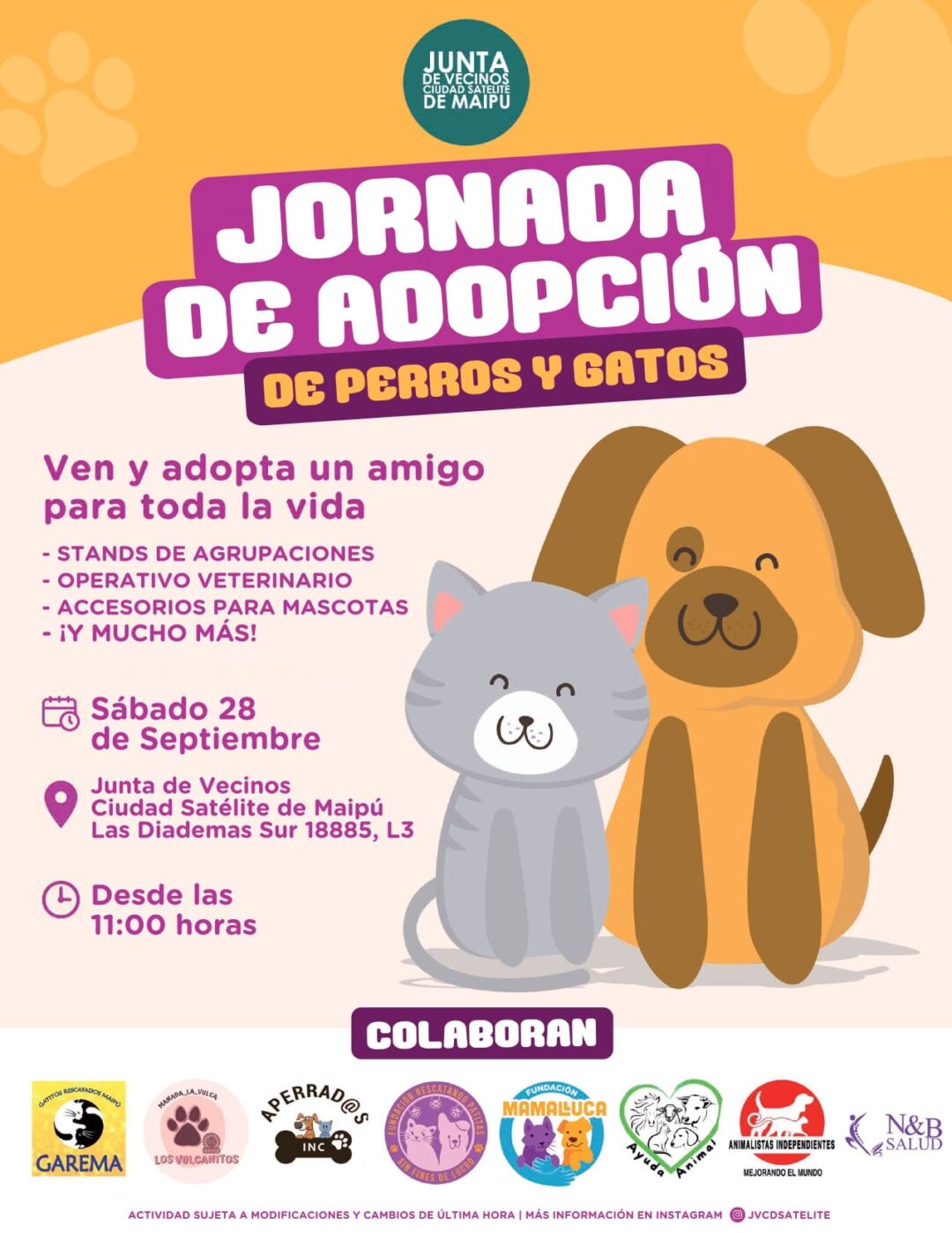 Este sábado 28 de septiembre, la Junta de Vecinos de Ciudad Satélite, en Maipú, organiza una emocionante Jornada de Adopción de Perros y Gatos. El evento se llevará a cabo desde las 11:00 a.m. en la Sede de la junta vecinal ubicada en Las Diademas Sur 18885 (Plaza Las Diademas) donde estarán disponibles muchos animales en busca de un hogar lleno de amor.