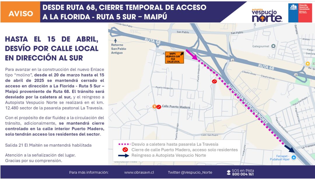 Desde el 20 de marzo hasta el 15 de abril de 2025, se mantendrá cerrado el acceso desde la Ruta 68 en dirección a La Florida – Ruta 5 Sur – Maipú, con desvío por la caletera al sur y reingreso en el km 12.480, sector pasarela La Travesía.