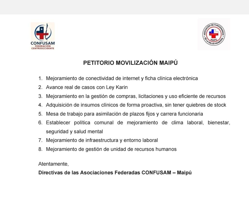 “Durante tres jornadas, las y los trabajadores de la salud primaria demostramos unidad, convicción y compromiso con nuestra comunidad. Hoy culminamos esta movilización entregando nuestro petitorio al administrador municipal y marchando hasta la alcaldía de Maipú, exigiendo respuestas concretas y respeto hacia quienes sostenemos día a día la atención primaria”, publicó AFUSAM Maipú en sus redes sociales, junto a imágenes de la jornada.
