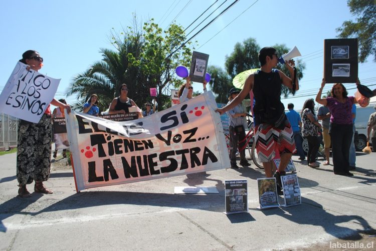 A unos cuantos metros de lxs vecinxs y sus pancartas, parado en medio de la calle con un megáfono en una de sus manos y unas listas de recopilación de firmas en la otra se encontraba Rodrigo Sánchez, activo miembro de la organización Ciclistas Camino a Melipilla, que por ahora también está abocado a la defensa de la vida de los animales: