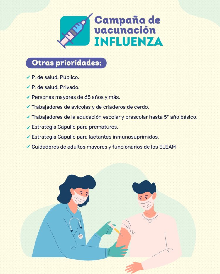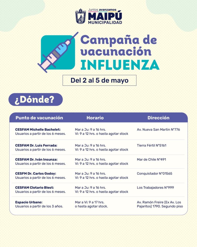 A continuación, el Calendario de vacunación contra la Influenza con sus respectivos locales de vacunación y horarios de atención en Maipú: