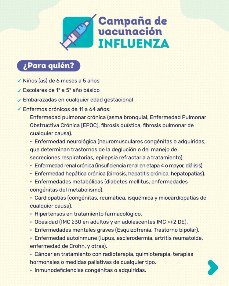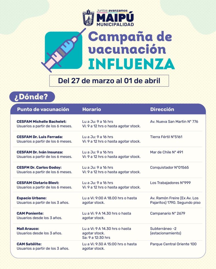A continuación, el Calendario de vacunación contra la Influenza, seguido del Calendario de vacunación contra el Covid-19 con sus respectivos locales de vacunación y horarios de atención: