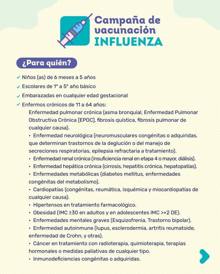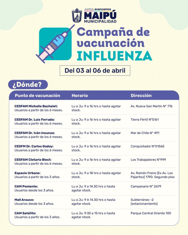 A continuación, el Calendario de vacunación contra la Influenza, seguido del Calendario de vacunación contra el Covid-19 con sus respectivos locales de vacunación y horarios de atención: