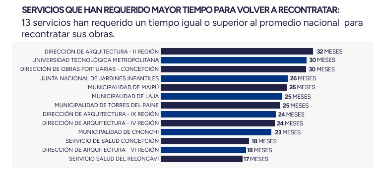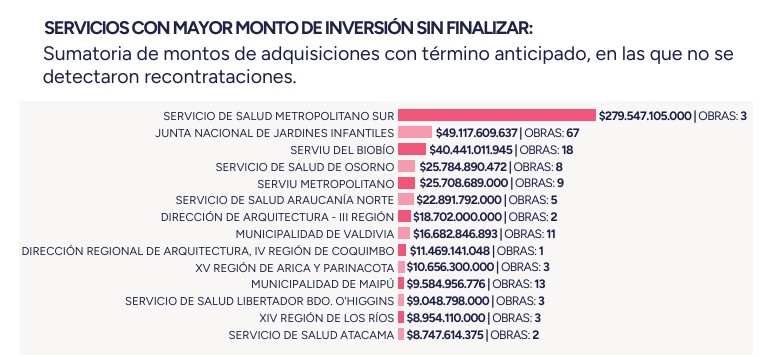 De acuerdo con el consolidado, Maipú se encuentra dentro del listado nacional de servicios con más recursos comprometidos en obras inconclusas. Con 13 proyectos paralizados sin recontratación, supera ampliamente a otras municipalidades mencionadas en el informe.