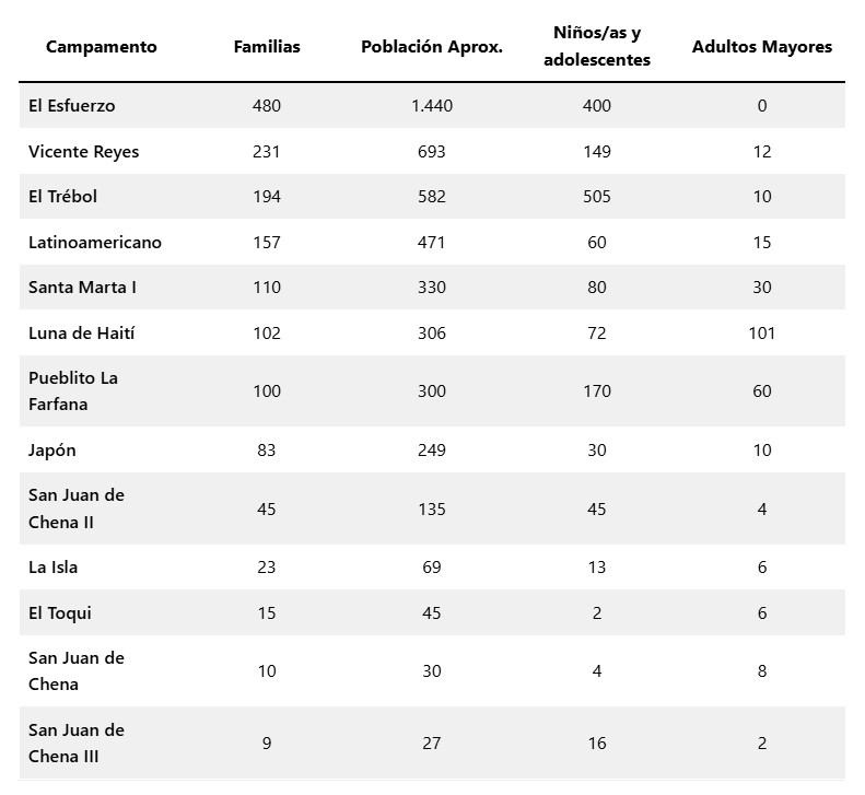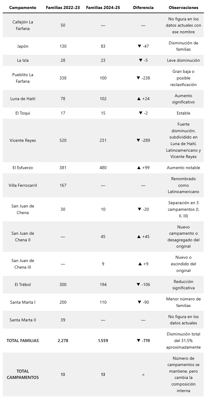 A pesar de que varios campamentos han disminuido en tamaño o desaparecido, otros han crecido o se han consolidado, como es el caso de El Esfuerzo y Luna de Haití.