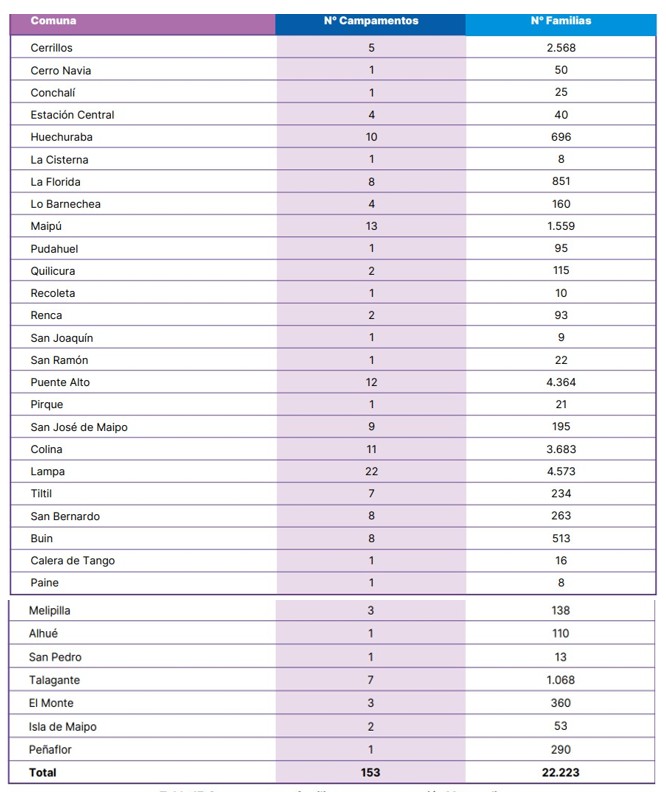 En la Región Metropolitana, hay menos campamentos (153) que el año anterior (167) —una disminución del 8,3%—, pero la cantidad de familias viviendo en ellos ha aumentado un 9,1% (de 20.355 a 22.223). Es decir, hay menos campamentos, pero están más poblados.